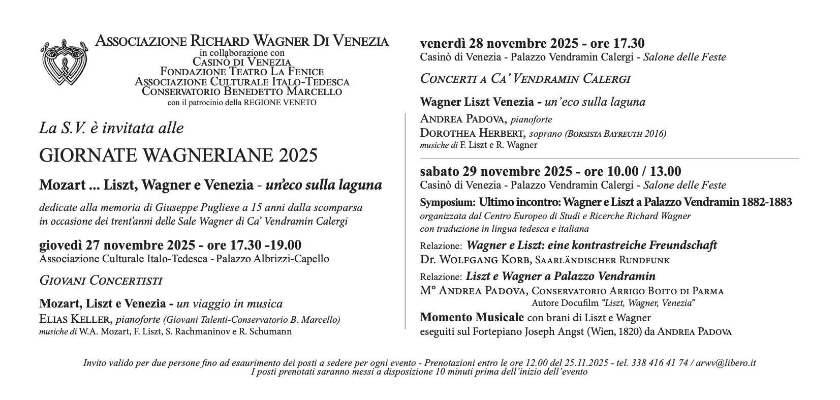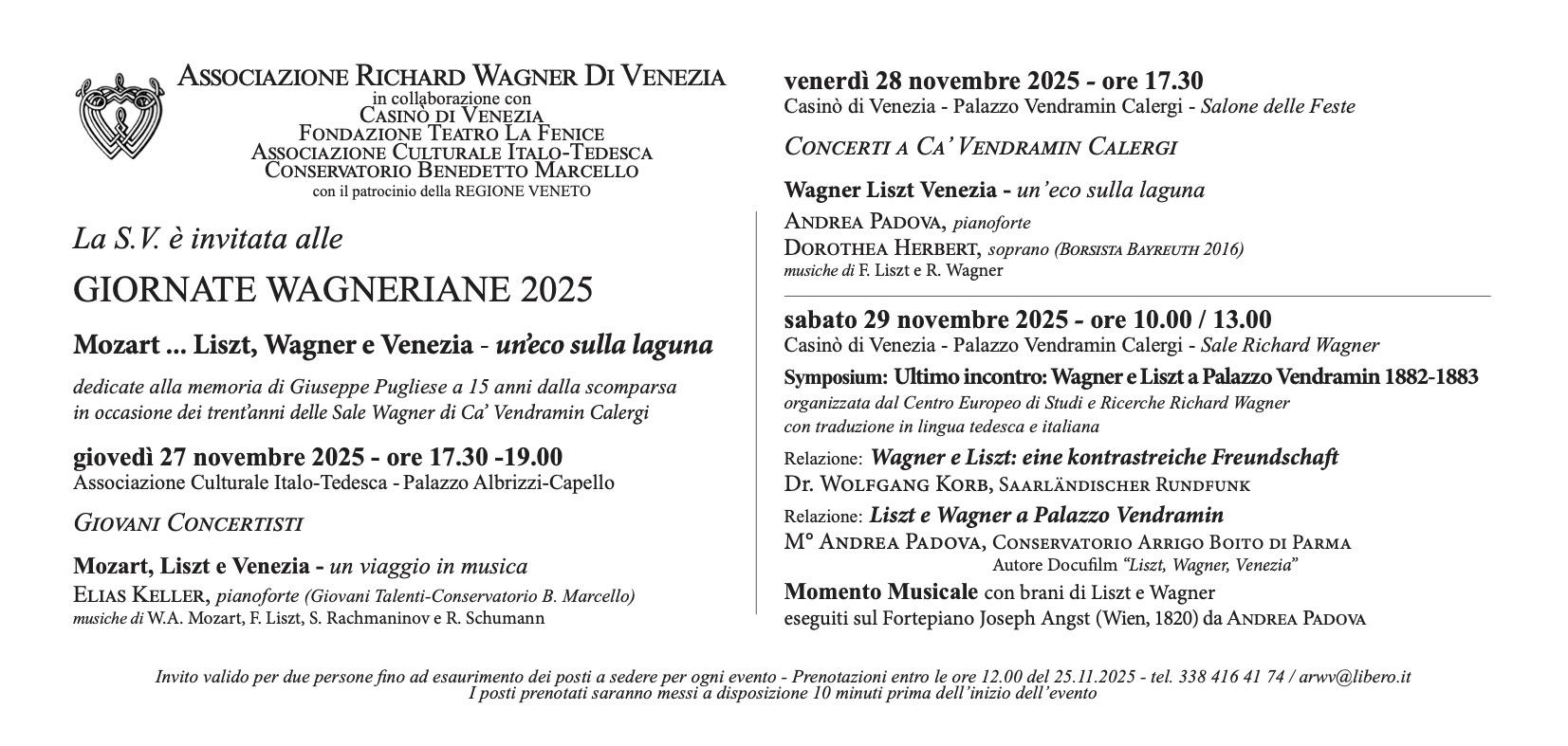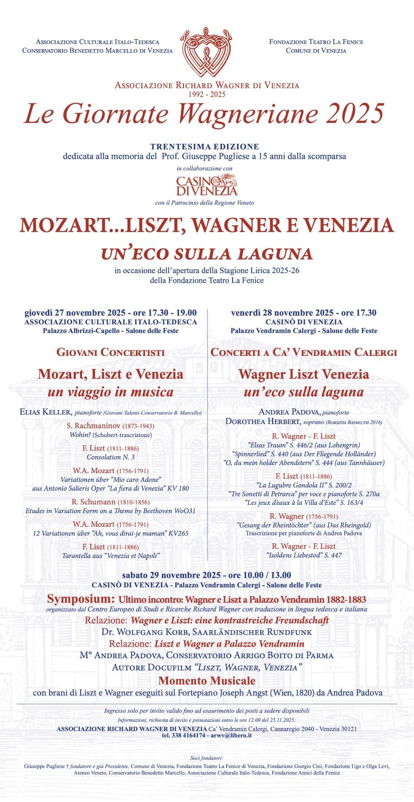 Sabato 29 novembre 2025, infine, il symposium nelle Sale Wagner di Palazzo Vendramin Calergi dalle ore 10 alle ore 13, sarà dedicato al rapporto tra i due grandi compositori Franz Liszt e Richard Wagner con una relazione su “Wagner e Liszt: un’amicizia ricca di contrasti” del musicologo tedesco Dr. Wolfgang Korb (redattore emerito della Saarländischer Rundfunk). Il musicologo, Maestro Andrea Padova (docente al Conservatorio Arrigo Boito di Parma), invece illustrerà nella sua relazione “Liszt e Wagner a Palazzo Vendramin Cagileri” i punti più salienti dell’ultimo incontro fra i due musicisti, avvenuto proprio nelle Sale Wagner da metà novembre 1882 a metà gennaio 1883.